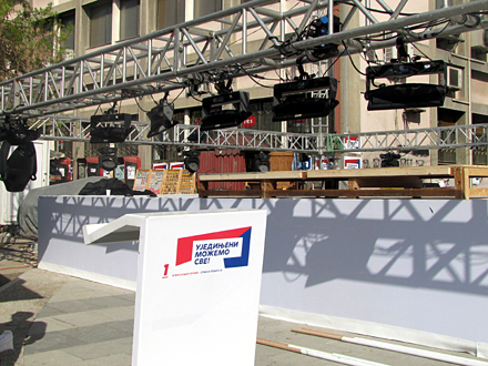 Moćno ozvučenje firme „Sky music“ najavljuje da će se reči Aleksandra Vučića čuti u skoro celom gradu.