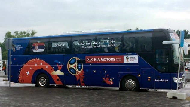 Pomenuti slogan ispisan je na autobusu kojim se najbolji fudbaleri Srbije prevoze tokom Svetskog prvenstva u najvećoj zemlji sveta.