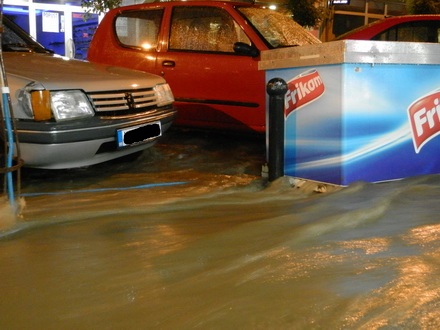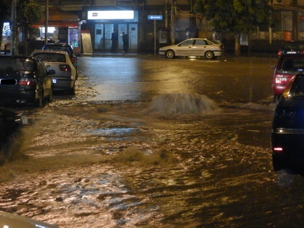 Glavna gradska ulica i trotoari bili su pod vodom dubokom skoro pola metra, a velika količina vode izbijala je na sredini ulice Stefana Prvovenčanog kod Grčke banke.