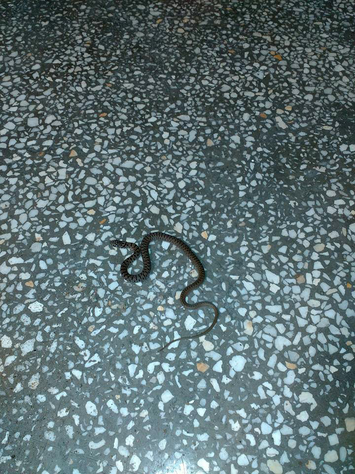 Ovaj, srećom neotrovan primerak zmije, uočili su radnici škole koji su radili na sređivanju prostorija i pripremanju za prvi radni dan u novoj školskoj godini.
